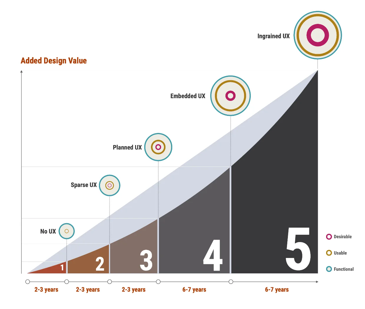 5 - Ingrained UX: Design team focuses on creating a shared experience vision, uses user research and storytelling supported by strong user-centric design principles, and it is a driving force to determine the product direction and priorities. Non-designers highly value design, learn skills, gain knowledge and design taste through working with designers closely, and infuse a design culture within the organization.