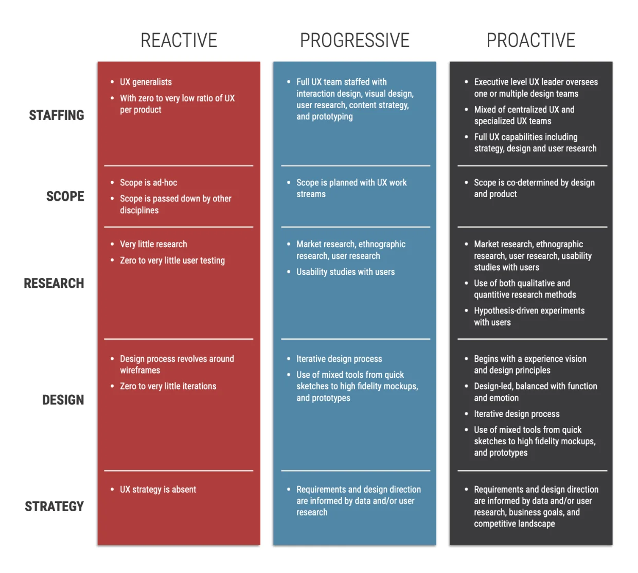 It is always a struggle to move an organization from being reactive to proactive, and most of the time they are not ready for it when they are first introduced to the UX discipline. In order to enable a design team to deliver great experiences at a more effective level, we must realize where the organization/team is in terms of design maturity stage and increase the design maturity over time by acquiring the appropriate skills, knowledge and instill a design culture within the organization. Many UX pioneers have done studies and UX Maturity models and you can find them online. In summary, UX Maturity can be categorized into five stages: No UX, Sparse UX, Planned UX, Embedded UX, and Ingrained UX.