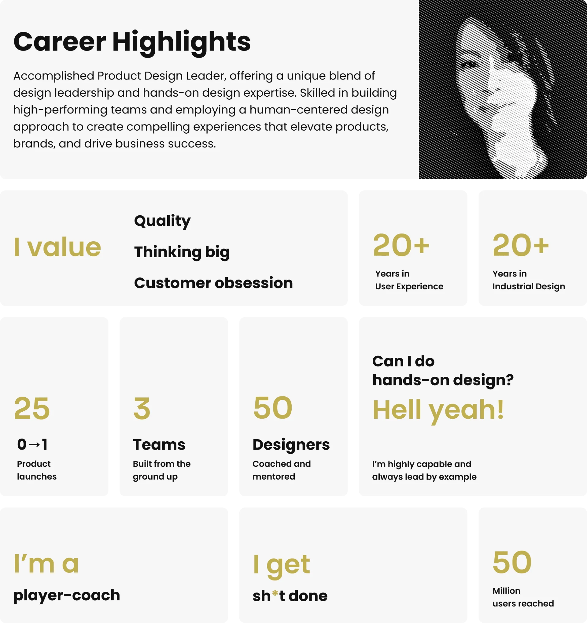 I inspire and align leaders with a compelling vision that drives success. With expertise in design principles and processes, I work to ensure that the outcomes of design initiatives are strategically tied to business goals, creating tangible value and impact. Through my unique blend of strategic vision, design expertise, and commitment to professional development, I am well-positioned to make a meaningful impact in any organization that values design excellence and innovation.