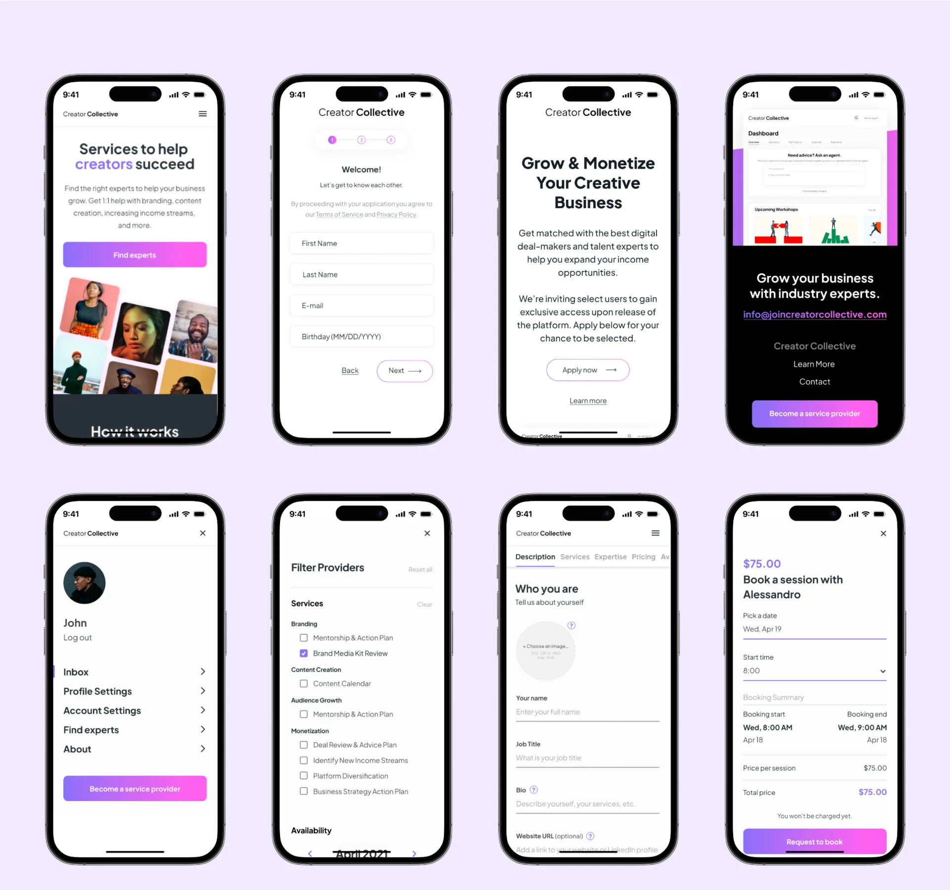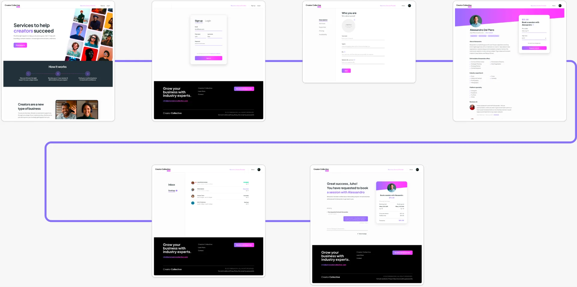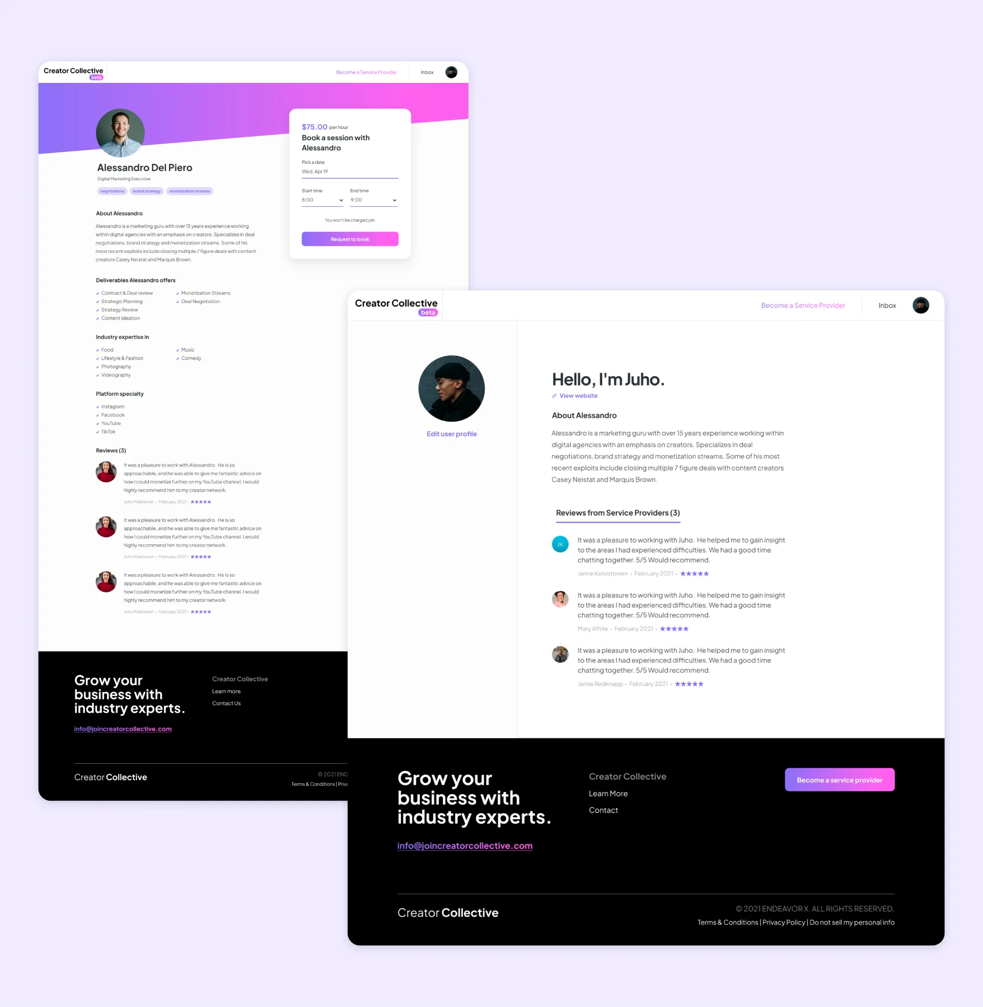 UX, Web DesignCreator Collective is a service marketplace that matches content creators with subject matter experts who can provide mentorship, guidance, and support to help creators build sustainable businesses. As the VP of Product Design, I played a pivotal role in shaping the strategy, facilitating alignment across teams, and executing the product design.