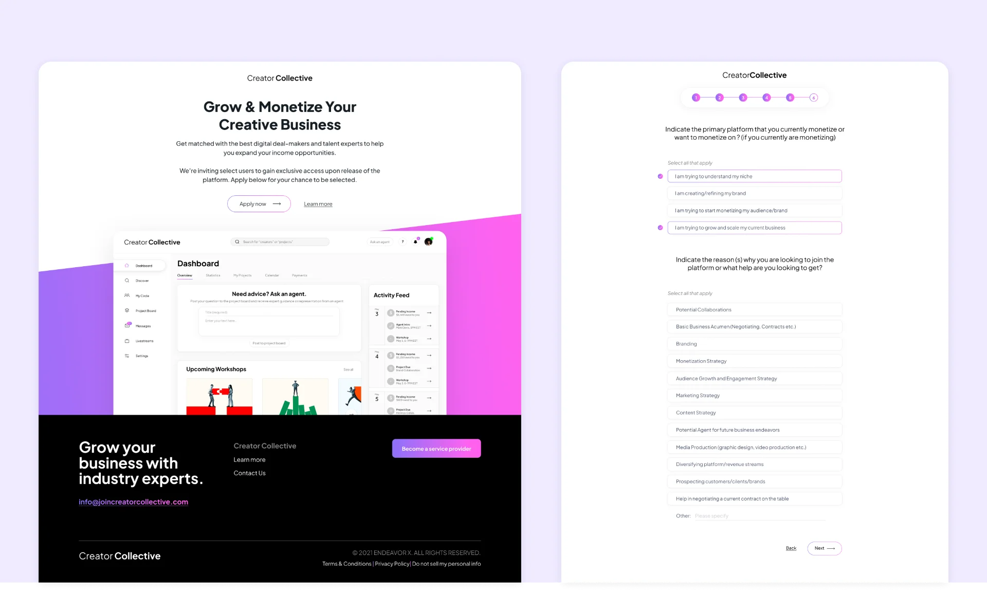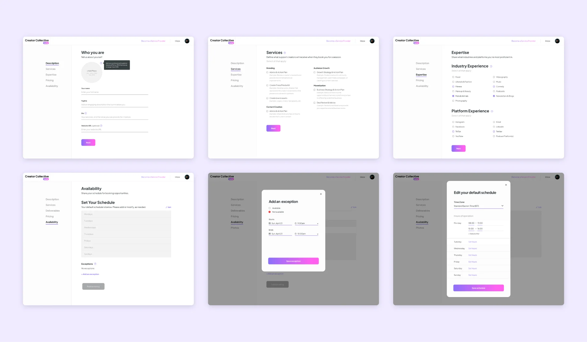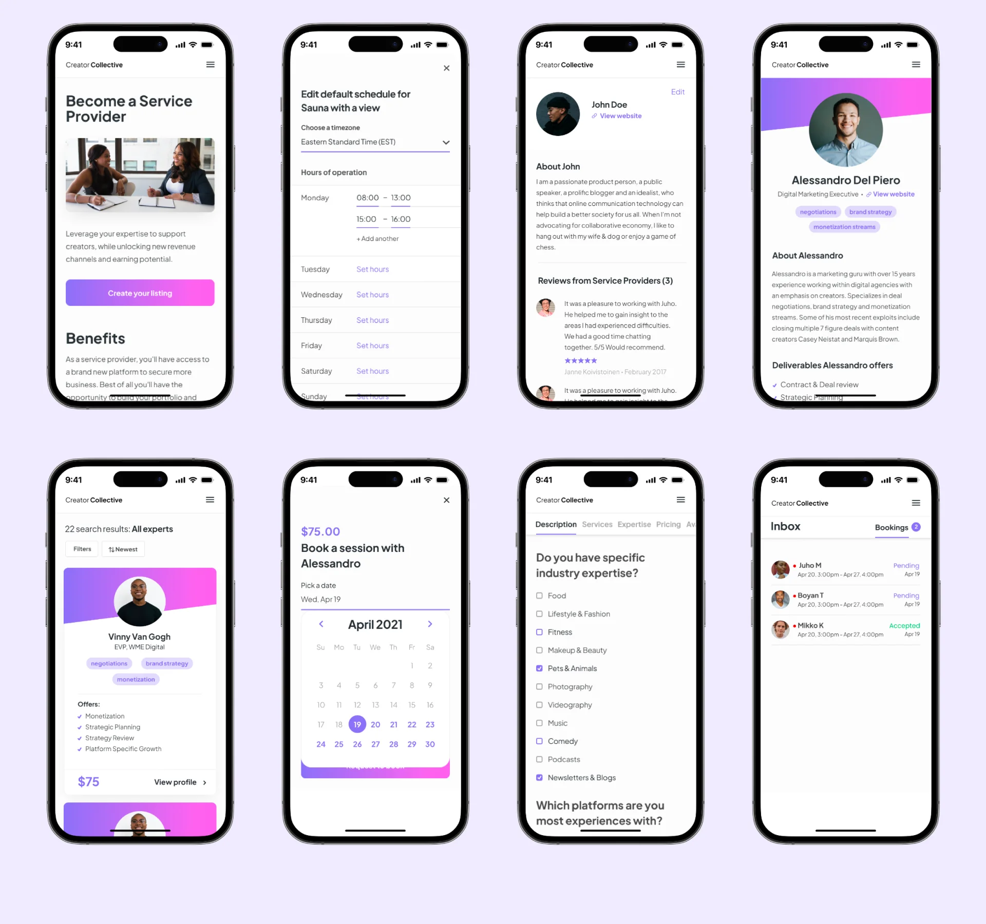 UX, Web DesignCreator Collective is a service marketplace that matches content creators with subject matter experts who can provide mentorship, guidance, and support to help creators build sustainable businesses. As the VP of Product Design, I played a pivotal role in shaping the strategy, facilitating alignment across teams, and executing the product design.