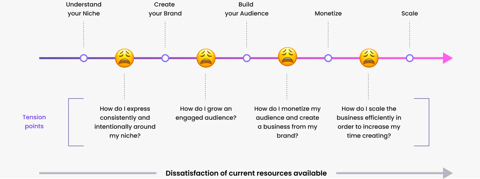 Pivoting our strategy, we applied the "Discover, Define, Design, Iterate, and Learn" framework to maintain focus and continued investing in user research. Our insights revealed that creators encounter various tension points depending on their stage of business development, and a consistent set of problems emerged across all segments: