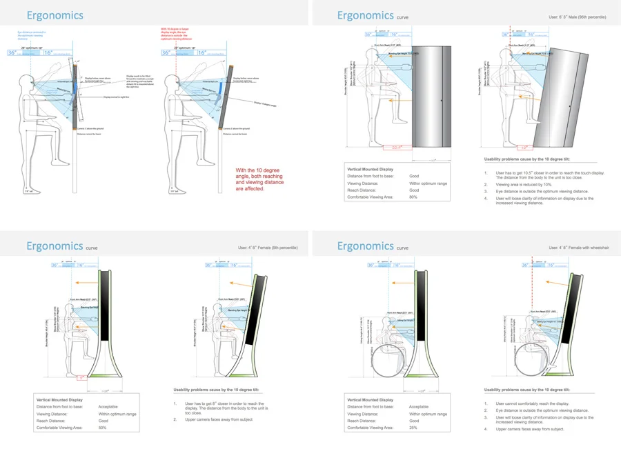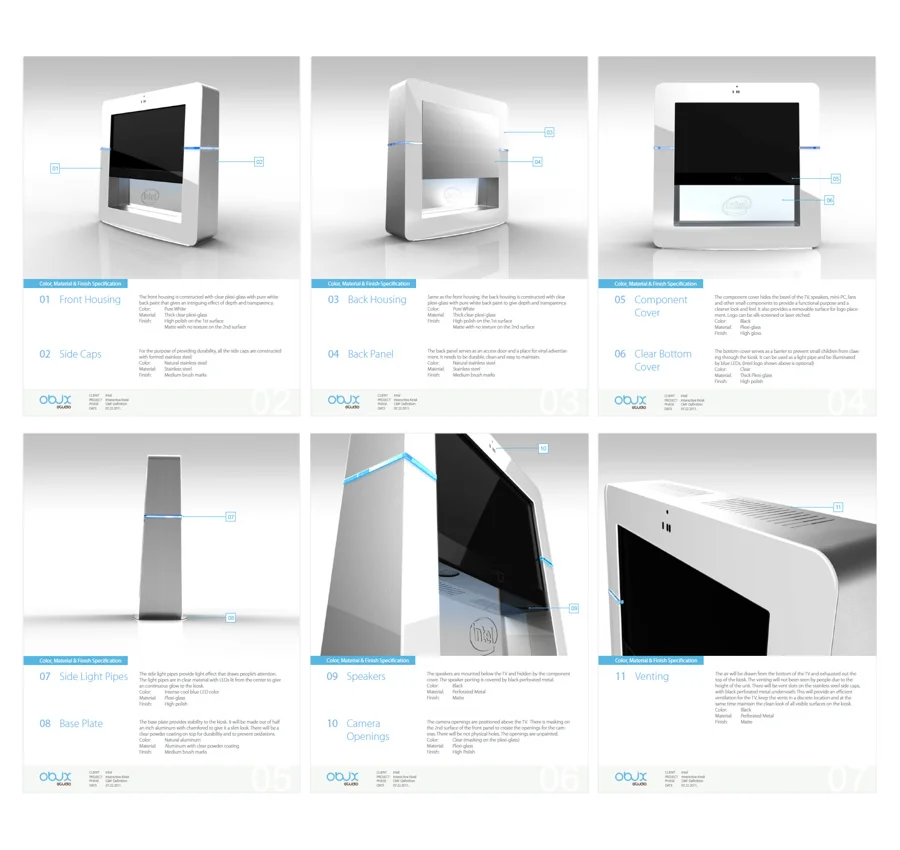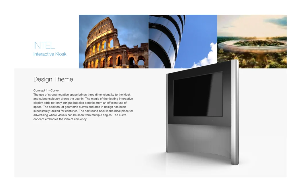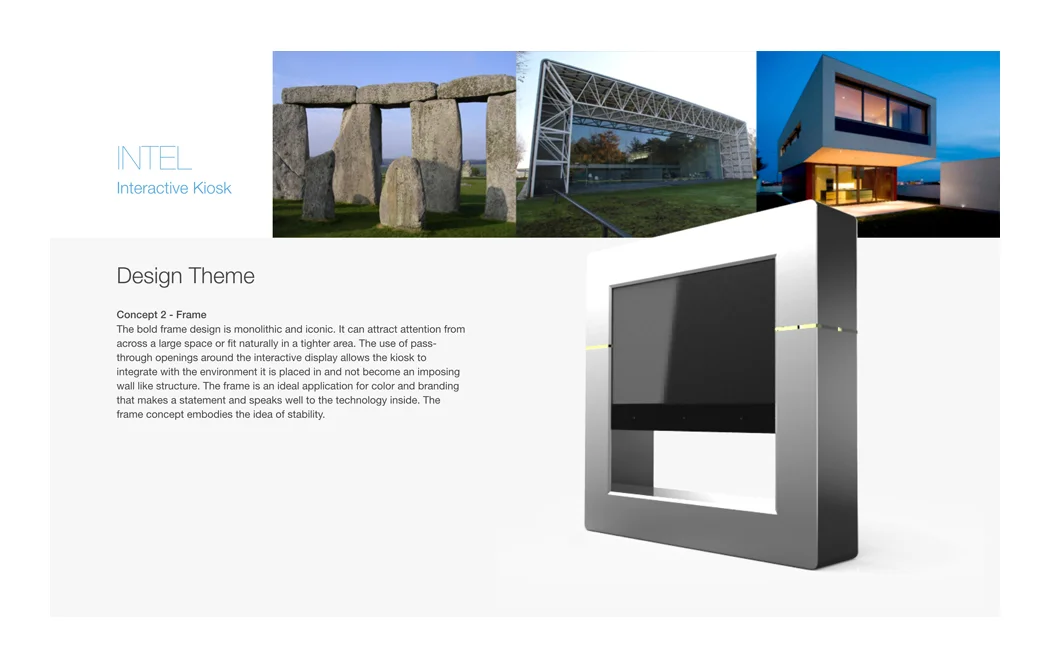 The objective of the project is to create a free standing interactive kiosk that is simple, intuitive, contemporary, visually appealing, approachable and purposeful. The design wants to attract attention, be a focal point and draw users in to the experience. The design should consider the many potential environments where it may reside and utilize the appropriate materials and assembly processes for efficiency, quality and durability. The kiosk incorporates a touch based interactive display along with the necessary technology components to complete the experience. The back of the kiosk will feature two dimensional advertizing space along with an access panel for maintenance of the components inside.