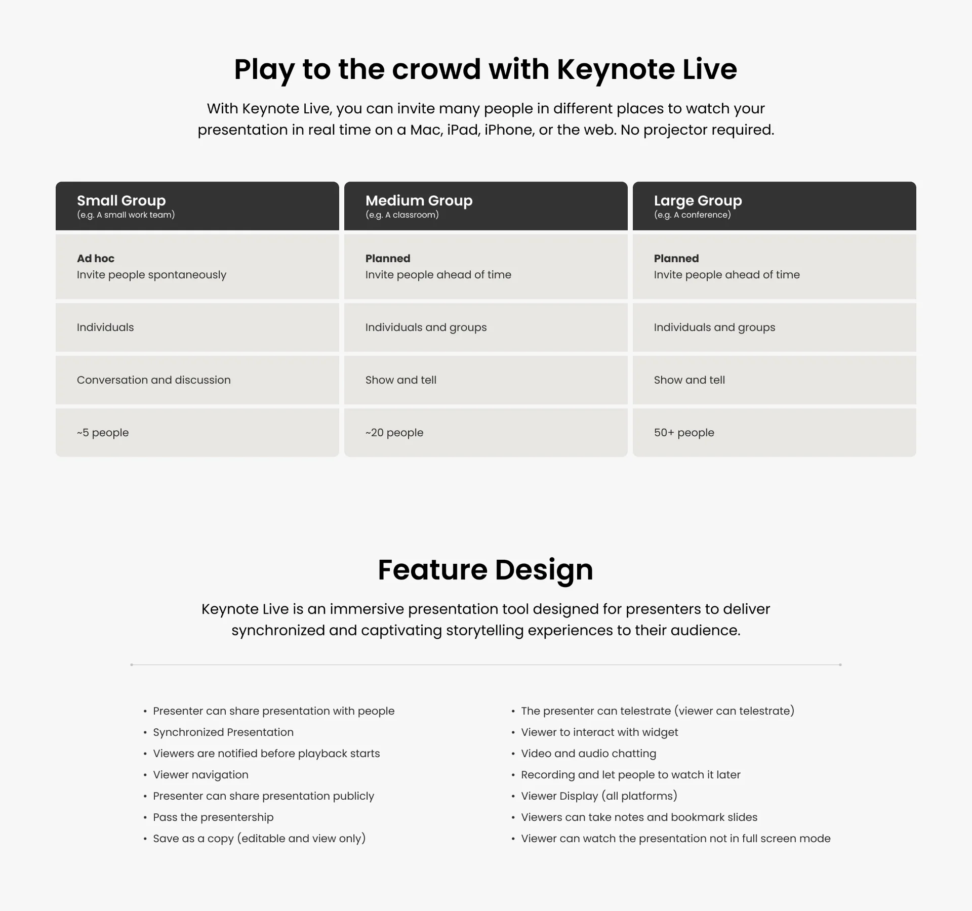 Keynote Live is a new presentation tool that helps facilitate collaboration. As Collaboration was a #1 top priority for iWork, Keynote Live was introduced to allow users to share and present their work in real-time to others no matter where they are, what platforms they use or devices they own.